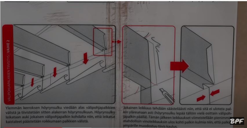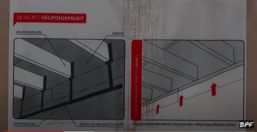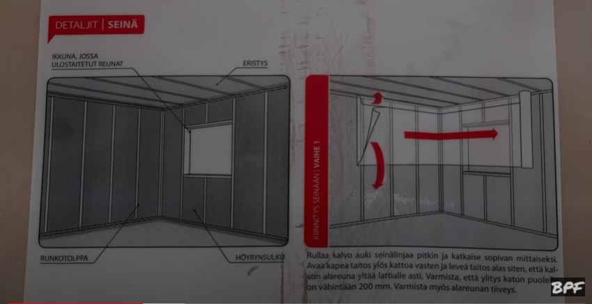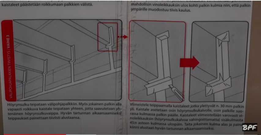 При монтаже пароизоляции мы растягиваем пленку полностью от края до края, прибиваем, наверх оставляем наш отворот который, пойдет потом на потолок и приклеиваться будет. И опускаем вниз. Так как у нас была уже прибита Kertopuu (LVL брус), к которой крепилась межэтажное перекрытие, за ним мы поставили изначально пароизоляцию, чтобы к ней потом приклеится.
