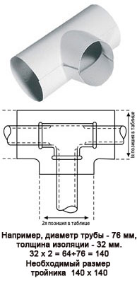 К примеру: Диаметр трубы - 76 мм , толщина изоляции - 32 мм. 32 х 2 = 64 + 76 = 140. Необходимый размер тройника - 140 х 140. |